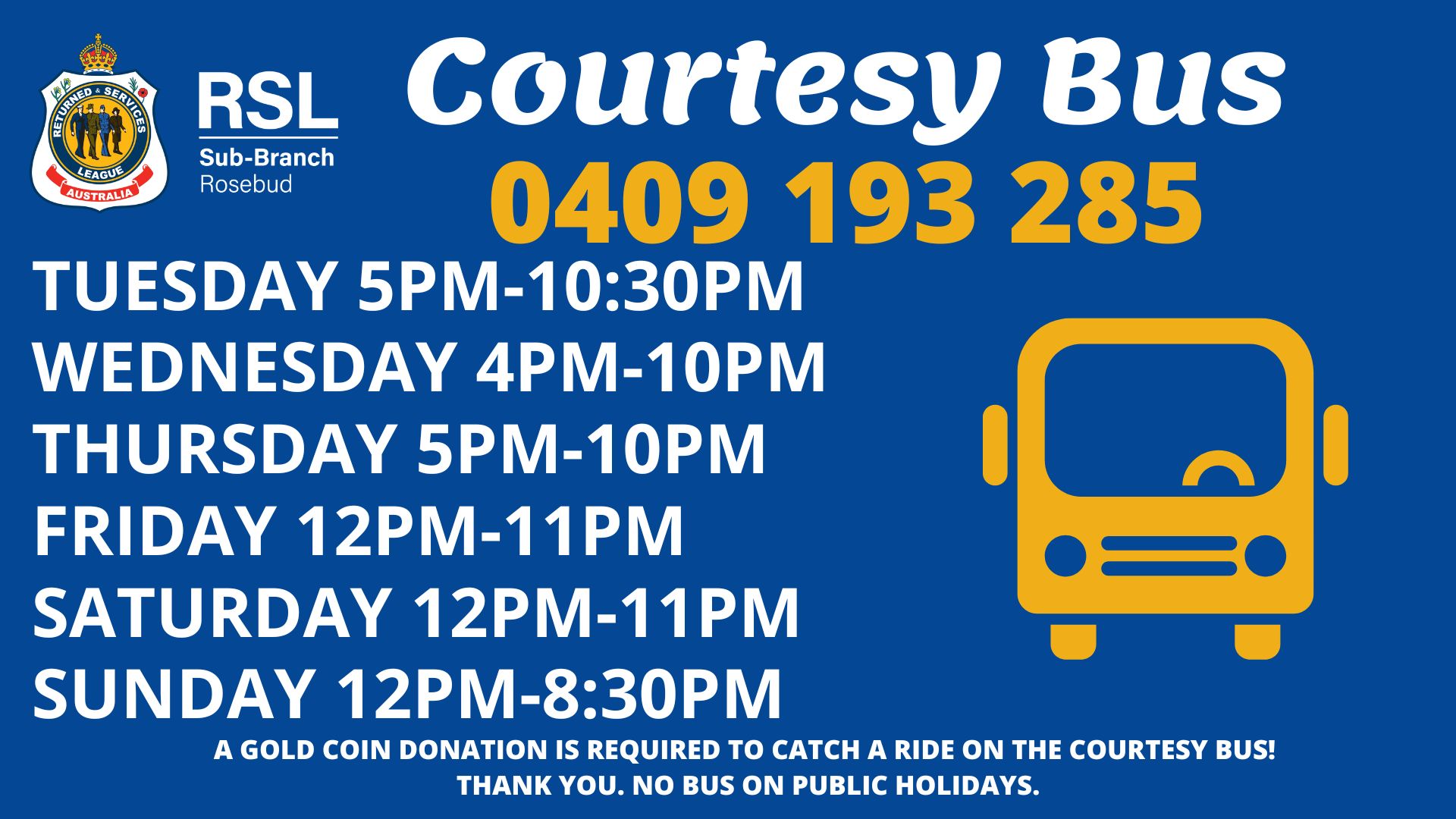 The Courtesy bus will only travel within a 5km radius of the Rosebud RSL.
